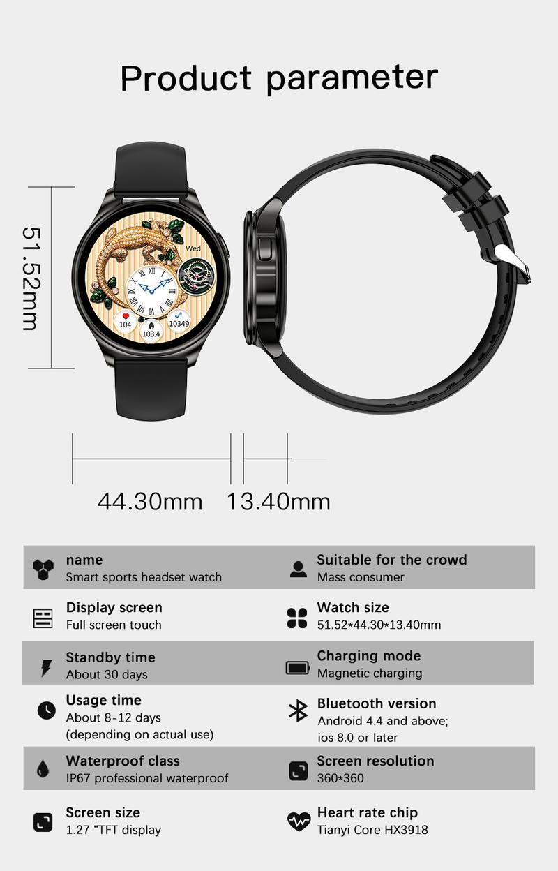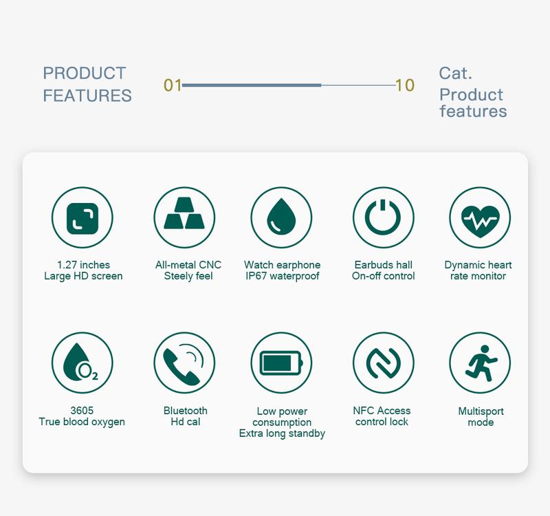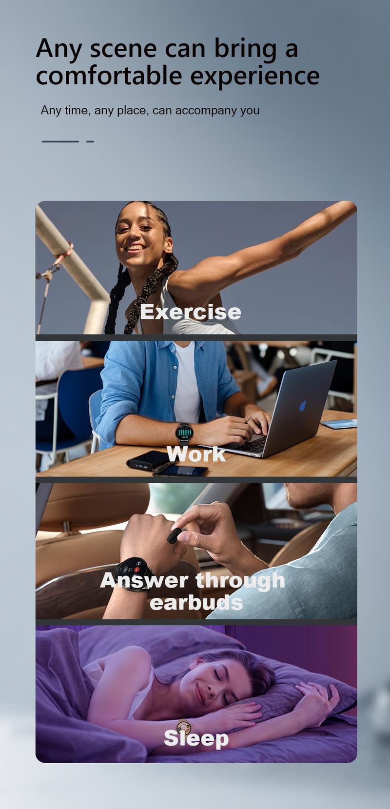 Functions: TWS earbuds integrated, message push, notifications, stopwatch, alarm, etc.