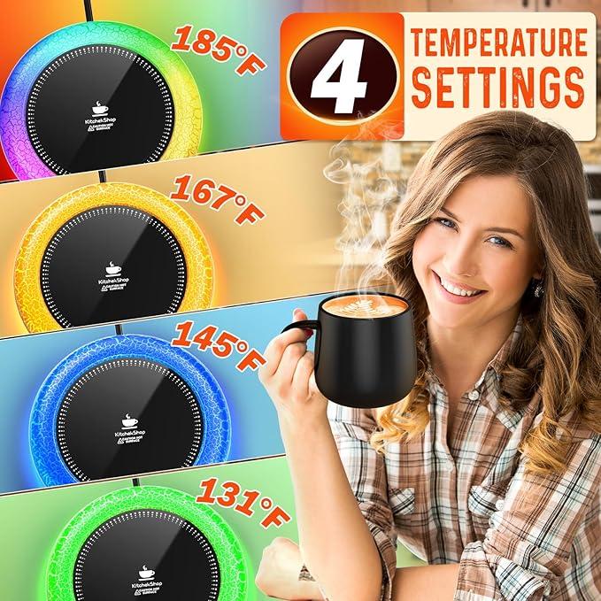 - 【4 Temperature Settings for Your Preference】Discover ultimate beverage customization with our coffee warmer's four temperature settings. Effortlessly toggle between 131°F, 145°F, 167°F, and 185°F to pinpoint the exact warmth you desire. Whether your taste leans towards a mild, soothing warmth or a steaming cup of java, our mug warmer places you firmly in charge.