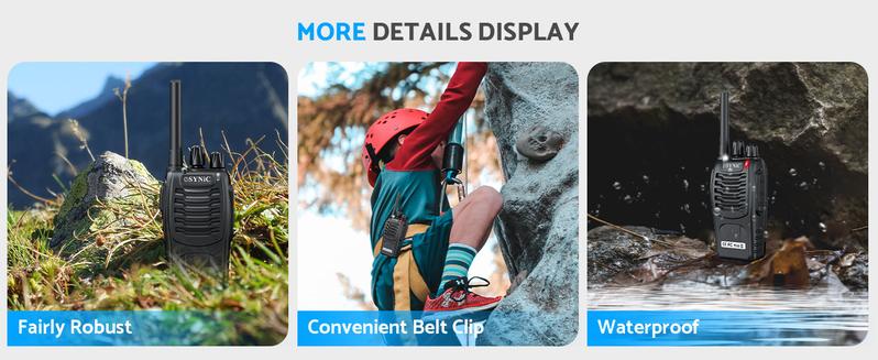 - * *----:Our eSynic 2 Way Radio Walkie Talkies Undergo Rigorous Testing and Validation, Ensuring Outstanding Durability and Reliability.They are Built with Sturdy Materials and Feature Waterproof Designs, Capable of Withstanding Harsh Working Environments While Consistently Providing Reliable Communication Service.