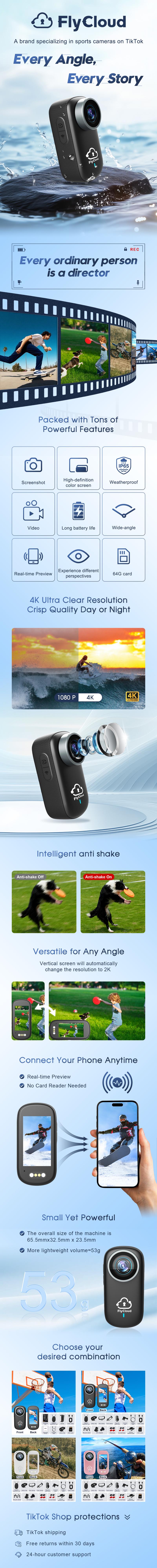 The FlyCloud One 4K Mini Camera is perfect for various activities. It offers waterproof protection and anti-shake features, ensuring clear footage. Capture every moment with this versatile camera. Ideal for outdoor activities, it's your companion for all your recording needs.