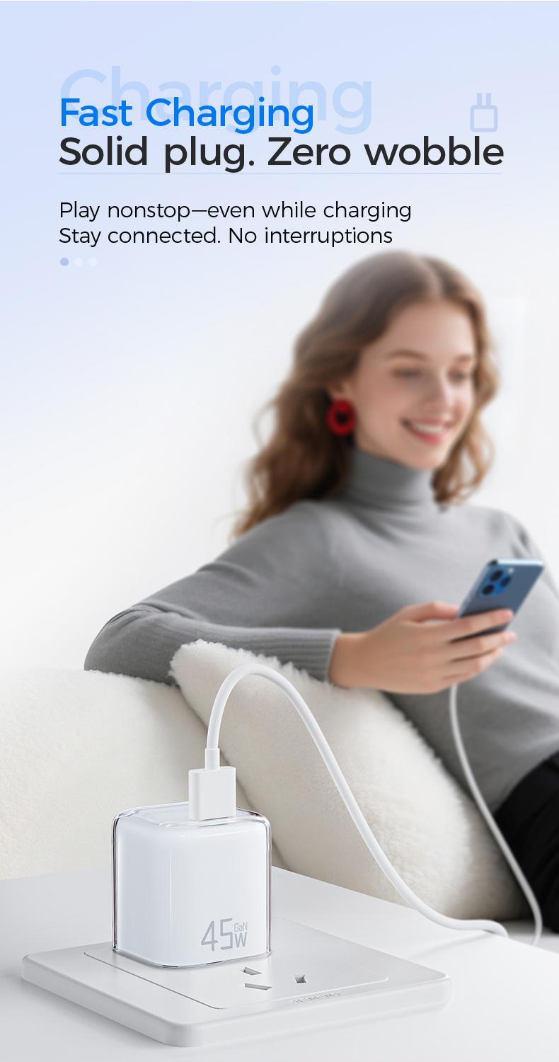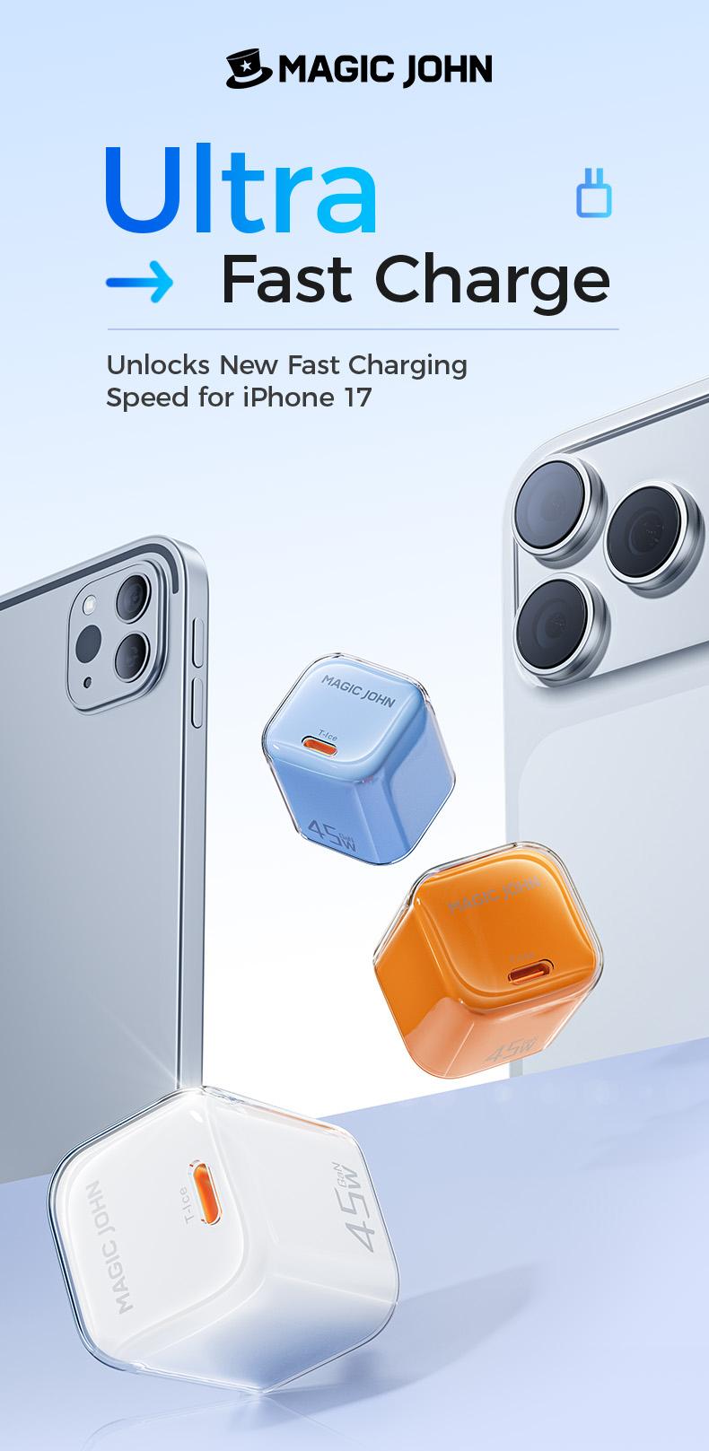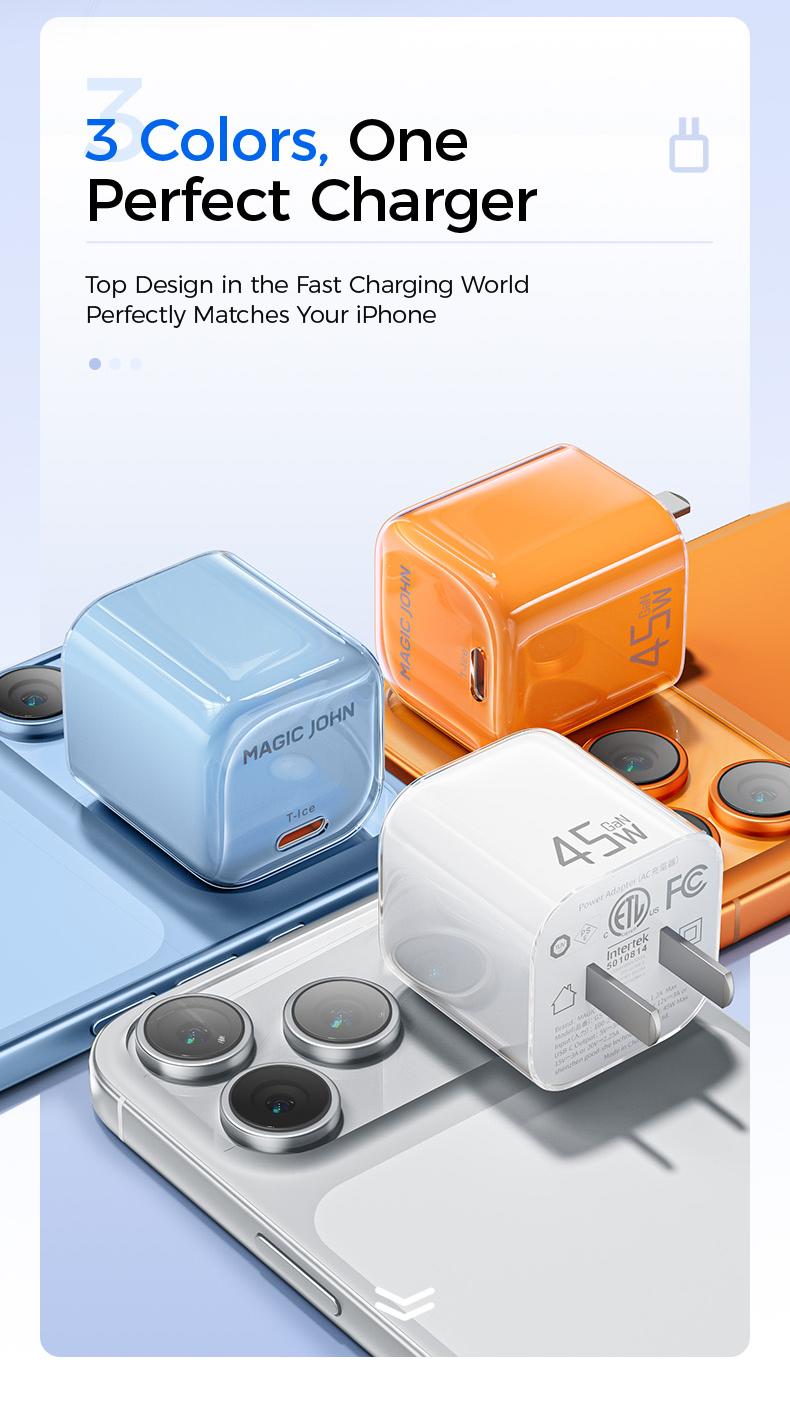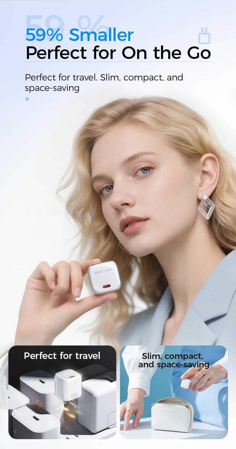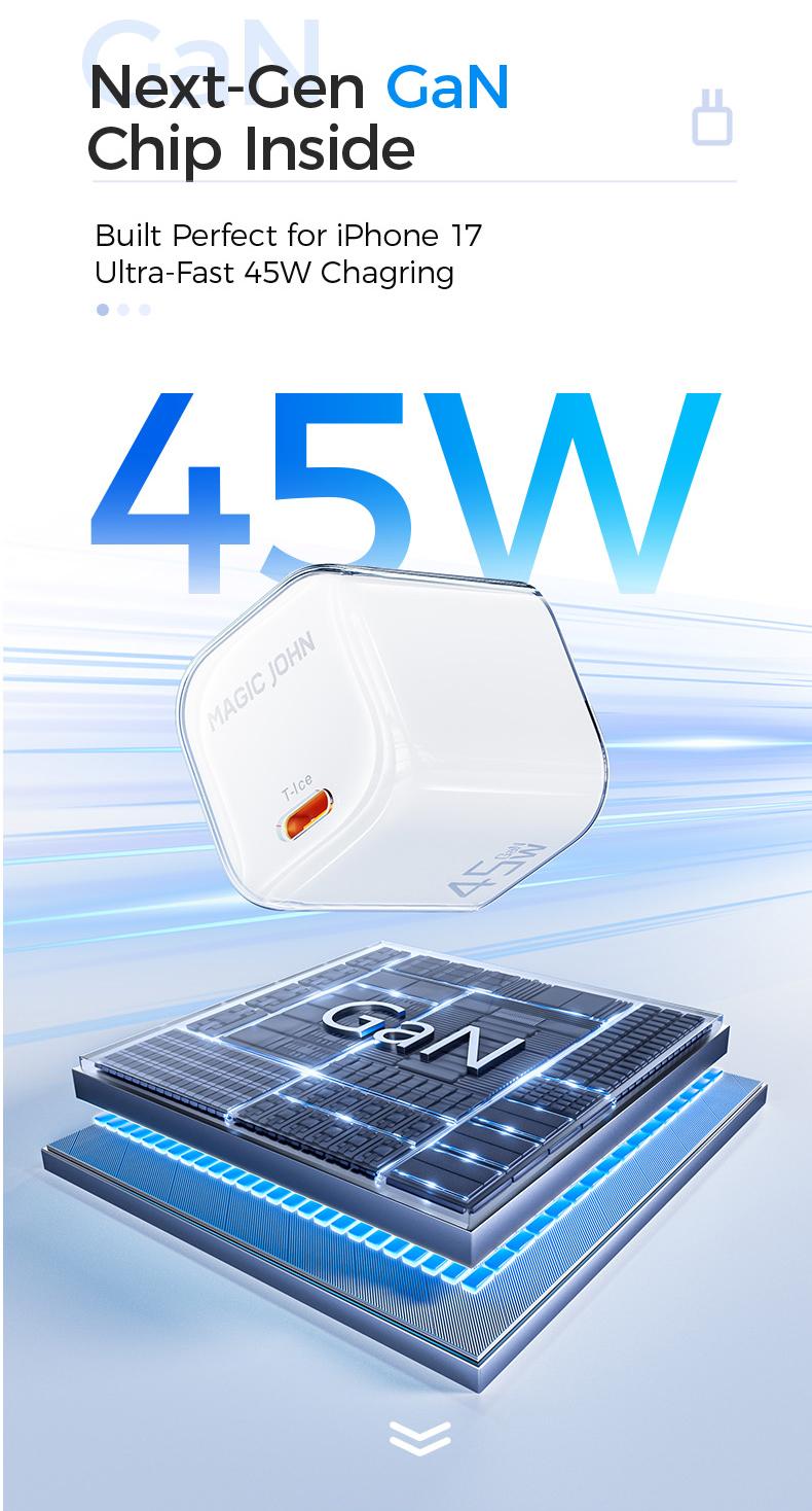 Power up your devices faster with the MAGICJOHN 45W USB-C Fast Charger. Compact, lightweight, and built for efficiency, it delivers up to 50% charge in just 30 minutes — perfect for travel or everyday use.