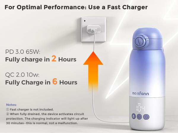 - Powerful Battery for All Day: Supports multiple heating cycles on a single charge, It can heat 4 oz of milk from room temperature to 98°F at least 22 times on a full charge. 2 hours with a 65W fast charger or in 6 hours with a standard 10W charger, using the included fast-charging cable, Portable bottle warmer for breastmilk and formula is appropriate for both short trips and long journeys