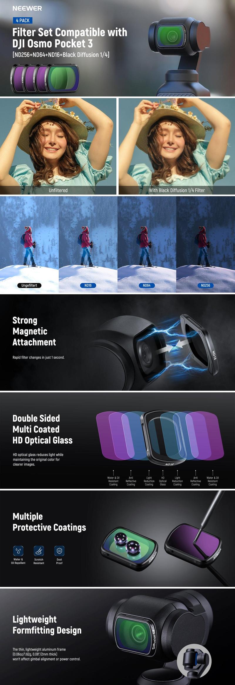 - Dedicated to OSMO Pocket 3- Introducing the latest must have Magnetic Variable ND filter set compatible with DJI OSMO Pocket 3, featuring an instant and secure magnetic attachment It boasts HD optical glass for crystal clear imaging during vlogging camera shooting, and is a game changer for handheld gimbal camera enthusiasts looking to optimize shutter speeds, minimize glare, enrich colors, and achieve impeccable exposure in varying weather conditions