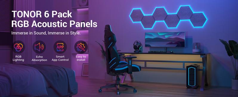 TONOR RGB Acoustic Panels – Self-Adhesive Soundproof Dampening Insulation for Gaming, Streaming, Podcast & Studio