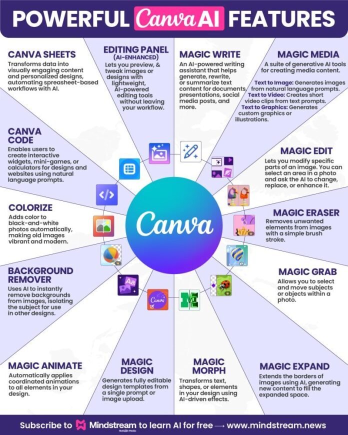 Canva’s Magic Studio includes several powerful AI-driven features that work together seamlessly. These tools are designed to reduce design time by up to 70% while maintaining professional quality standards. Each feature serves a specific purpose in your design workflow, from initial concept to final polish. Understanding how each tool works and when to use it is key to maximizing Canva AI’s potential for your projects.